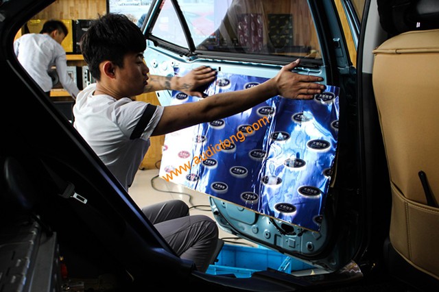 首先要做的是隔音工作,采用中国大能蓝金刚隔音材料和超级温莎棉进行四门标准隔音,是大能隔音研发出来的高品质隔音材料,具有隔热、隔音、降噪、吸音等效果,能增加车内气密性,减少钣金共振,降低噪音。